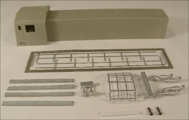 De bouwset bevat een giethars kap en witmetalen onderdelen. Ook bevat de bouwset een geëtst nieuwzilver hekwerk, foto hieronder.