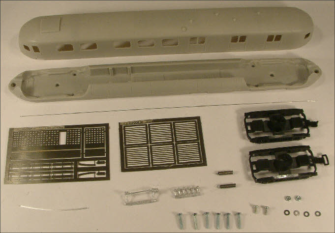 De bouwset bevat een giethars kap en bodemplaat, witmetalen onderdelen, geëtste onderdelen, draaistellen en staaldraad voor de handgrepen, zie foto hieronder. De kap is voorbereid op Mastica mat.’54 ramen.