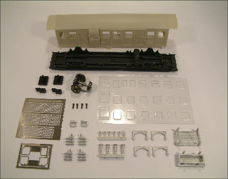 bouwset bevat een giethars kap en bodemplaat, assen, vacuüm gevormde ramen, geëtste